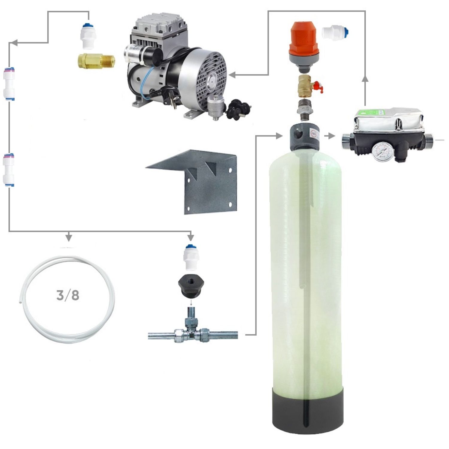 Напорная аэрация подразумевает отсутствие потери давления в трубопроводе. При напорной аэрации воды воздух при помощи компрессора или эжектора подается в трубопровод. Далее водо-воздушная смесь подается в контактную камеру: напорный корпус или на статический миксер, обеспечивающий необходимое время контакта. Из контактной камеры вода поступает на систему фильтрации практически без потери исходного давления. При использовании напорной аэрации воды в верхней части контактной камеры устанавливают воздухосбросный клапан для удаления лишнего воздуха и удаленных из воды газов. Контактная камера, распределительный оголовок с трубками и восдухосбросный клапан в сборе называются аэрационной колонной.